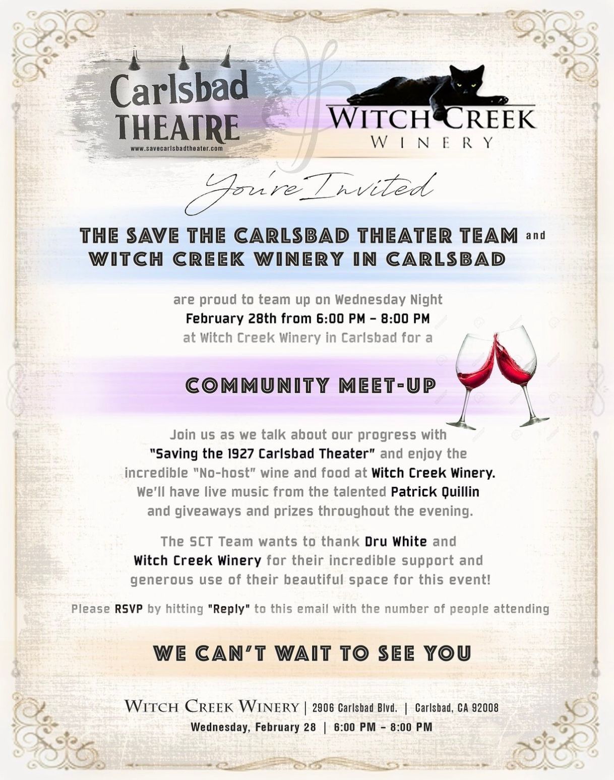 Join the Save the Carlsbad Theater Team at Witch Creek Winery on February 28th.