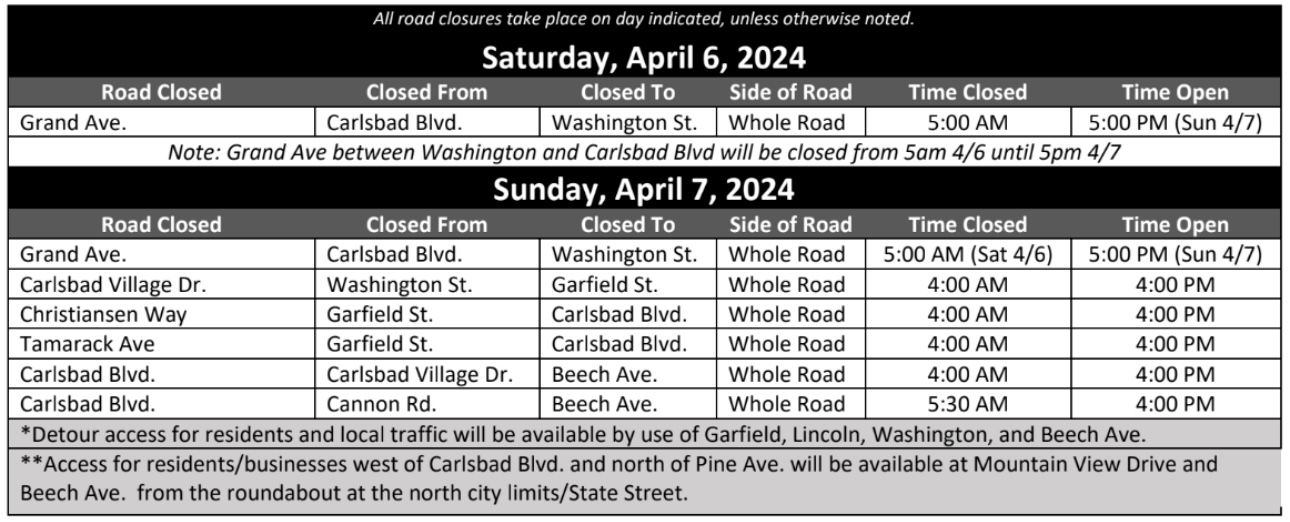 Important Note: Road closures will be in effect starting as early as 6:00 a.m. on Saturday, April 6th, and 4:30 a.m. on Sunday, April 7th. Roads will reopen on a rolling basis following the last race of the day, as determined by local law enforcement.