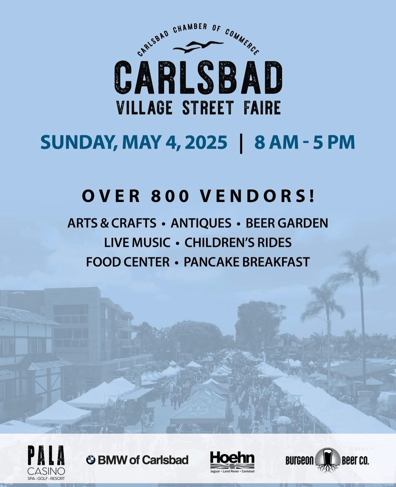 This Sunday, May 4th, downtown Carlsbad will come alive as the Carlsbad Village Street Faire returns for a full day of shopping, food, entertainment, and community fun. From 8:00 AM to 5:00 PM, visitors from across the region will gather to enjoy one of the largest one-day street festivals in the country.