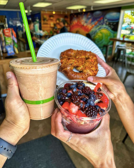 Beach City Smoothies: Beach City Smoothies is a smoothie and juice bar centrally located in Carlsbad Village just a few short blocks East of the Coast Highway and West of the I-5 located at 594 Carlsbad Village Dr. Serving Carlsbad Village since 2006, Beach City Smoothies specializes in delicious and nutritious 100% vine ripened fruit smoothies, Acai and Pitaya bowls, fresh organic veggie juices, wheatgrass and ginger shots, gourmet soft traditional and stuffed pretzels and healthy grab n' go snacks and drinks.