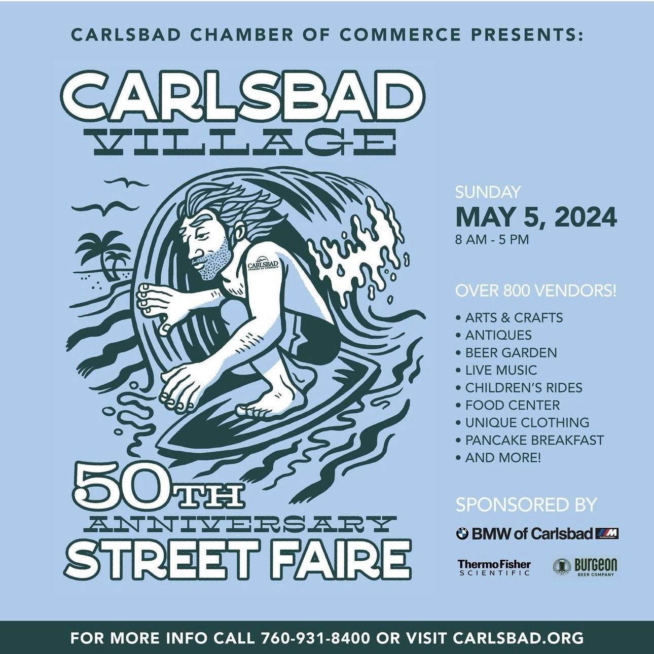 Get ready for a day of excitement, entertainment, and community spirit at the Carlsbad Village Street Faire, celebrating its 50th anniversary this Sunday, May 5th, from 8 AM to 5 PM. Organized by the Carlsbad Chamber of Commerce, this one-day event is a highlight of the year, featuring a vibrant mix of arts, crafts, antiques, music, and delicious international cuisine.