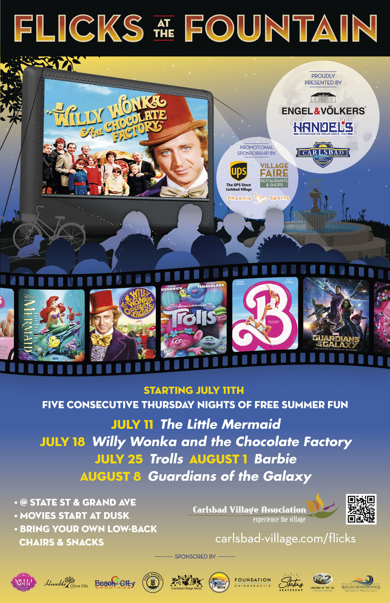 Flicks at the Fountain is back and better than ever! In less than three weeks, join us in the heart of Carlsbad Village for five magical Thursday nights of movies under the stars, from July 11th to August 8th. This beloved summer tradition transforms the fountain parking lot into an enchanting outdoor theater, with a lineup that promises fun for all ages.