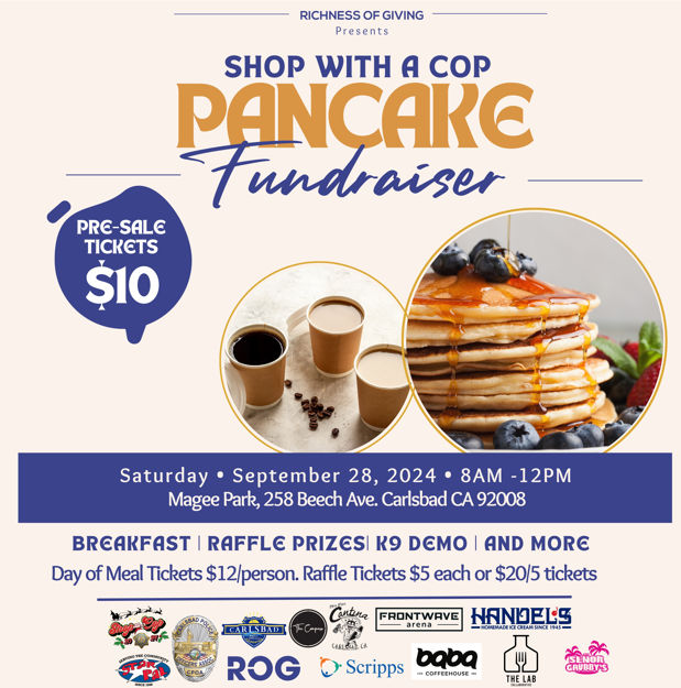 Join the community this Saturday, September 28, at Magee Park in Carlsbad for the annual Shop with a Cop Pancake Breakfast fundraiser from 8:00 AM to 12:00 PM. Presented by the Carlsbad Police Department and Richness of Giving, this family-friendly event offers a delicious breakfast and plenty of fun for a good cause.