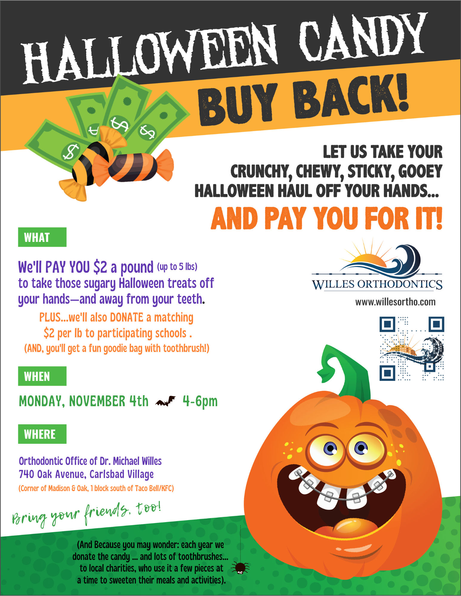 On Monday, November 4, from 4PM to 6PM, Willes Orthodontics invites families to join their annual Halloween Candy Buy-Back at 740 Oak Avenue in Carlsbad Village. Hosted by Willes Orthodontics, a longstanding Carlsbad Village Association business member, this event lets kids trade in their Halloween haul for cash…and a good cause.