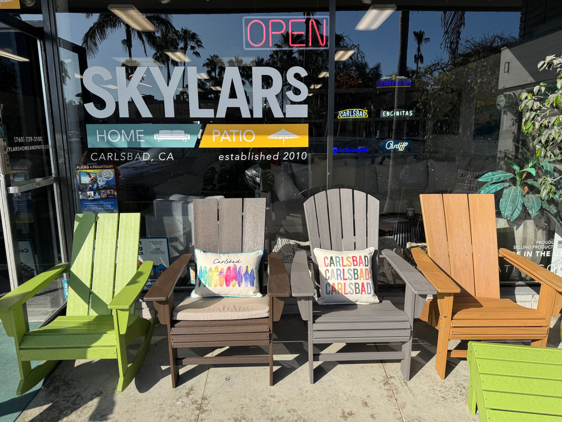 Skylar’s Home & Patio: Located on State Street in Carlsbad Village, Skylar’s Home & Patio offers high-quality indoor and outdoor furniture with a strong focus on comfort and design. Their curated showroom includes custom sectionals, fire pits, and weather-friendly patio seating—including the same Adirondack chairs featured in this giveaway. Follow them on Instagram at @skylarshomeandpatio.