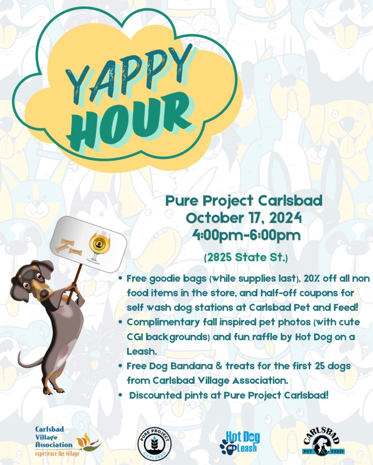 Carlsbad Village is about to get spooky with the final Yappy Hour of the year! On Thursday, October 17th, from 4:00pm to 6:00pm, join the Carlsbad Village Association (CVA), Pure Project Carlsbad, Carlsbad Pet & Feed, Hot Dog on a Leash, and fellow dog lovers for a fun-filled, Halloween-themed celebration.