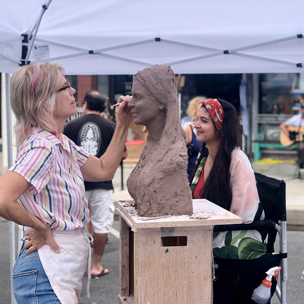 In addition to artmaking for kids and their families, take in four additional interactive experiences while you're here. At the North end of the venue, you will find live pottery demonstrations by Carlsbad Village's Handled Pottery. At the South end, come be mesmerized as Max Krop creates beautiful glass pieces and jewelry deftly using a handheld torch. At the East end, check out the printmaking station led by Campana Studios. And at the West end, we are pleased to have Lynn Forbes Sculpting Studio back with live sculpting.